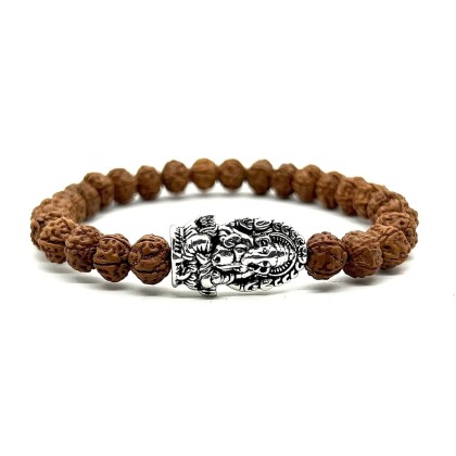 Rudraksha Beads Stretchable Bracelet - 8mm Real Chikna Rudraksh Beads - w/God Ganesha Ganesh Ganpati - Wrist Size 7.5 Inches
