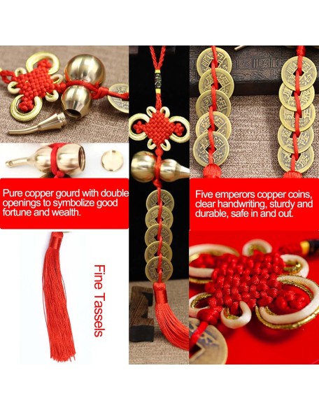- [Auspicious Symbol]: Chinese I Ching Feng Shui lucky coins are round on the outside and square on the inside, which can absorb people's bad luck and enhance their fortune; red Chinese knot means unity and happiness; Chinese feng shui wu lou decors(Gourd) drives away evil spirits and eliminates disasters; Pixiu can attract wealth and prosperity; the overall Chinese Feng Shui coins decor symbolism brings good luck, wealth, health and succes.