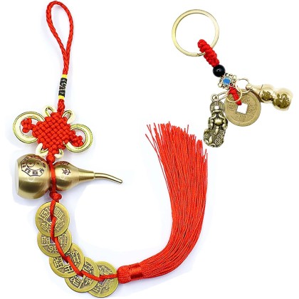 1PCS Chinese New Year Lucky Coins Charm Gourd Chinese Knot Tassel and 1PCS Feng Shui Key Chains Gourd with PIXIU Coin, Hanging Tassel Pendant Bring Luck Healt Wealth