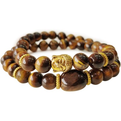 Tiger Eye Stone Buddha Double Fold Bracelet,Double Men's Gemstone Mala Wrap,Double Wrap Buddha Head Natural Healing Bracelet, Beaded Bracelet, Mala Bracelet for Men & Women (Brown)