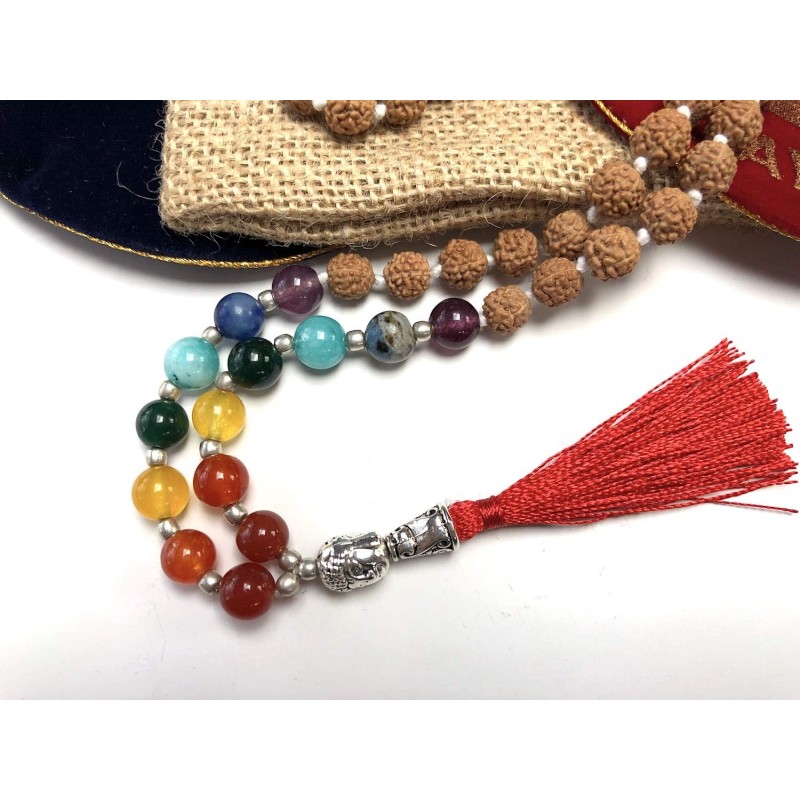 - Experience the timeless beauty and spiritual depth of our Hand Knotted 7 Chakra Rudraksha Mala Necklace. Crafted with meticulous attention to detail, this exquisite piece features 8mm Rudraksha beads and a Buddha guru bead made from zinc alloy, offering a blend of traditional spirituality and modern elegance.