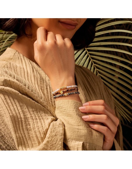 - 6.75" stretch. 3 Bracelets - 18K Gold Plated Brass. 4 mm Tiger's Eye Stones: courage, balance, protection. 4 mm Labradorite Stones: awareness, illumination, curiosity. 4 mm Pyrite Stones: wealth, success, protection. Culture: handmade in Bali, Indonesia. Ready to Gift for Her.