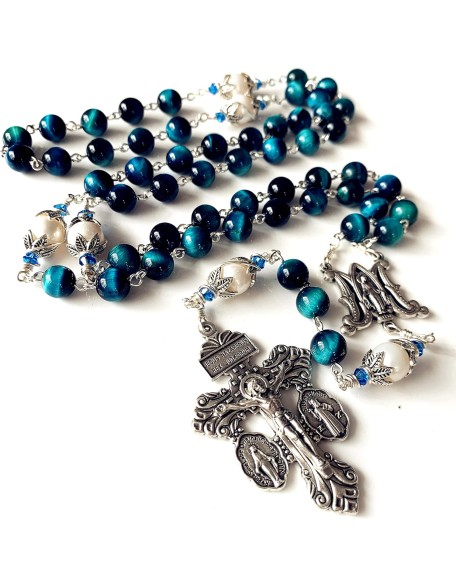 - elegantmedical HANDMADE Peacock Blue Tiger Eye Beads & (AAA)10mm Pearl Catholic 5 Decade Rosary Cross Necklace Gift Box Italy Parden Crucifix