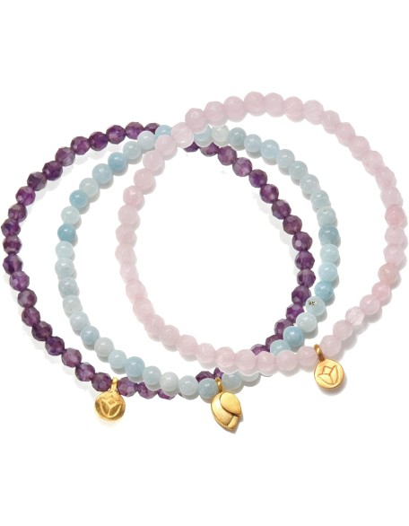 Gold Plated & Amethyst, Quartz, Aquamarine Mini Lotus Charm Stretch Women's Bracelet Set
